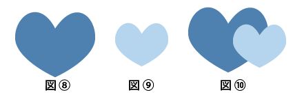 ⑦大きなハートと小さいハートを重ねた状態で、ウィンドウメニューのパスファインダーを選択して、合流を選択すると大小合体したハートの図形が作成されます。(図⑩)